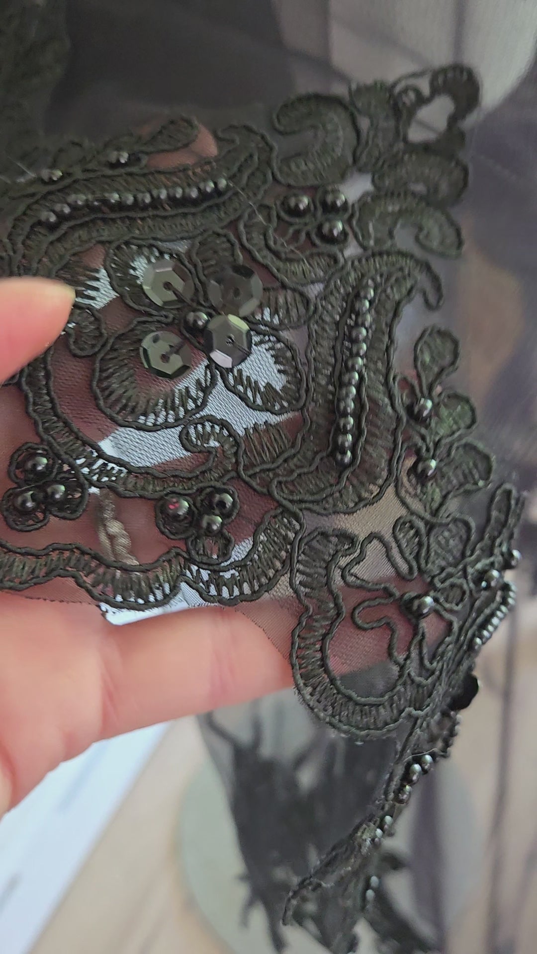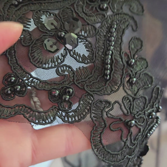 This veil is a gothic wedding dream veil. And is a handmade masterpiece with a gorgeous beaded and sequin lace trim, met with the prettiest gothic detail appliques throughout the train. This veil only comes in cathedral length and to complete the dramatic dark look it has an elbow length blusher to flow over your face as you walk down the aisle in your black wedding dress.