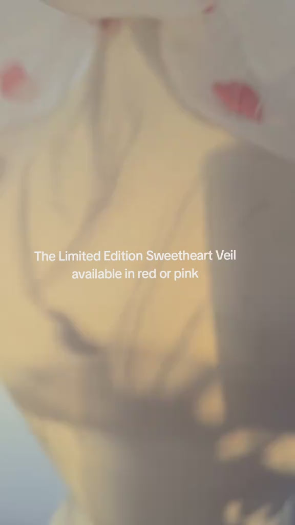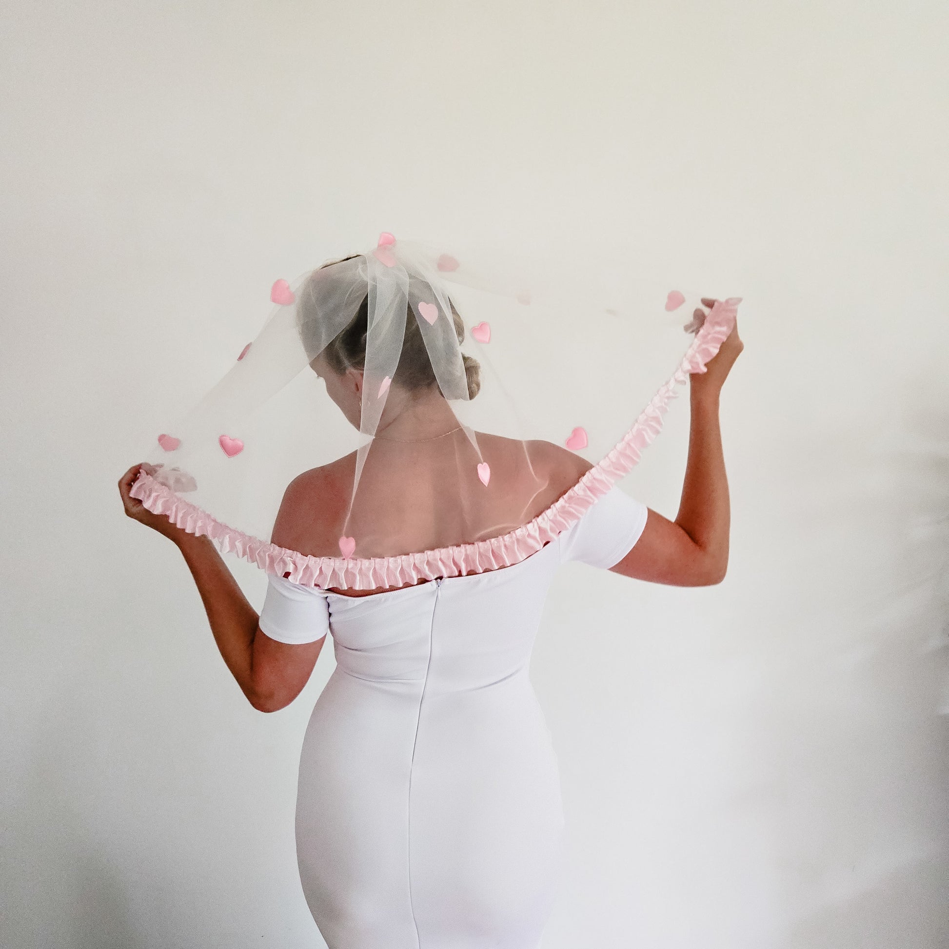 Unveil Radiant Romance: Made with silky soft tulle to create a romantic and stylish ambiance, seamlessly enhancing your bridal look with a touch of sophistication. Each "candy heart" is hand-sewn on and placed at random to create the cutest "stuffed" 3D heart pattern. Made with a satin ruffle trim, and pink hearts. A true statement veil. with a touch of modern edge, paired with a vintage rock and roll vibe. This is not your traditional veil.